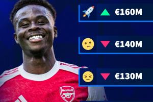 體育資訊10月15日訊 德國足球轉(zhuǎn)會市場將在10月17日更新英超球員身價,目前德轉(zhuǎn)已經(jīng)陸續(xù)放出了一批球員的身價變動進(jìn)行預(yù)熱,阿森納前鋒薩卡位列其中。