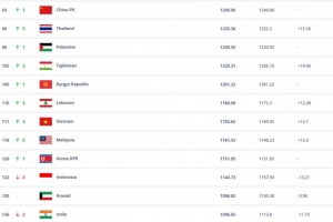 體育資訊10月17日訊 FIFA更新最新一期國家隊排名,亞足聯(lián)國家隊方面,國足積分不變,但排名從世界第94位升至世界第93位,亞洲排名則仍是第14位。