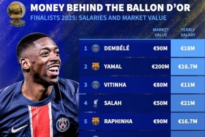 2025年金球獎(jiǎng)前10球員年薪(括號(hào)內(nèi)為德轉(zhuǎn)身價(jià))