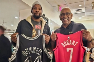 致敬前輩!杜蘭特和馬刺名宿“冰人”喬治-格文交換球衣