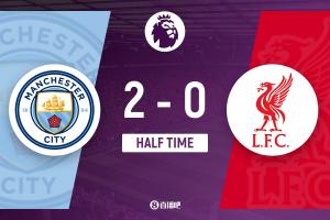 上半場補(bǔ)時7分鐘,曼城2-0利物浦。