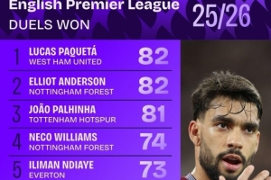 體育資訊11月11日訊 英超聯(lián)賽已經(jīng)進(jìn)行了11輪,squakwa也統(tǒng)計(jì)了本賽季英超成功對(duì)抗次數(shù),帕奎塔、安德森、帕利尼亞分列前三。