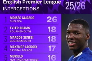 本賽季英超攔截榜:凱塞多獨(dú)自領(lǐng)跑,拉克魯瓦、詹姆斯在列