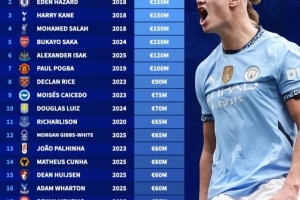 體育資訊11月12日訊 德國(guó)轉(zhuǎn)會(huì)市場(chǎng)盤點(diǎn)了英超各隊(duì)歷史身價(jià)最高球員,哈蘭德以2億歐居首,阿扎爾、凱恩、薩拉赫和薩卡均為1.5億歐。