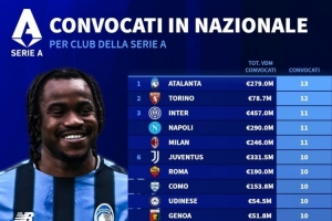 意甲被國家隊征召人數(shù)榜:亞特蘭大13人最多,國米、米蘭11人