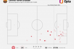 體育資訊11月12日訊 據(jù)Opta統(tǒng)計(jì),10月份國(guó)際比賽日之后,亞馬爾是五大聯(lián)賽同期嘗試過人次數(shù)最多的球員。