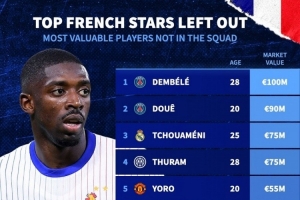 無緣本期法國隊球員身價:登貝萊1億歐最高,杜埃9000萬歐次席