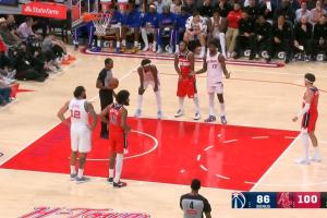 第三節(jié)32.2秒的罰球期間,現(xiàn)場(chǎng)能聽(tīng)到亞當(dāng)斯在怒斥伊森,聲音很大(現(xiàn)場(chǎng)錄像原聲清晰可聞)。伊森在對(duì)面站著攤手不解。