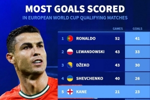 體育資訊11月17日訊 德國(guó)轉(zhuǎn)會(huì)市場(chǎng)列出了歐洲世預(yù)賽歷史射手榜,C羅41球居首,萊萬(wàn)33球次席,哈蘭德21球排在第7位。