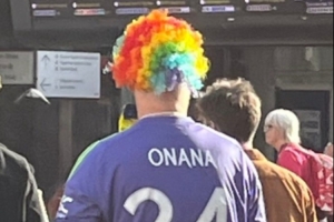 曼聯(lián)本輪英超不敵布倫特福德,記者Samuel Luckhurst曬出一位球迷身穿奧納納球迷的照片,這位球迷還戴了一頂小丑的假發(fā),該記者調(diào)侃道:可以肯定的是,這個小伙子不是奧納納的最大球迷。