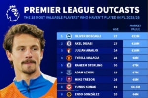 本賽季英超未出場(chǎng)球員身價(jià)榜:博斯卡利2000萬(wàn)歐居首,迪薩西第二