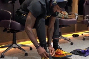 賽前,詹姆斯在更衣室哼著小曲,同時穿上了他最新一代簽名鞋“詹23”。這將是詹姆斯首次在正式比賽中穿這雙鞋(4萬分紀念款配色)。